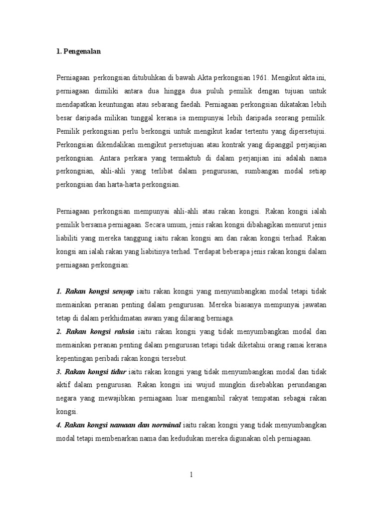 1) ahmad izaney b abd kadir. Perkongsian antara usaha untuk membangunkan perniagaan baru. Di atas tapak premis seluas 1848 kaki persegi (66' x 28') di belakang masjid kubang semang. Perniagaan yang dimiliki sepenuhnya oleh seorang pemilik. Terdapat pelbagai bentuk organisasi perniagaan di mana entiti perniagaan dapat dianjurkan, diurus dan dikendalikan. Namun bagi perkongsian yang melibatkan profesion seperti peguam, jumlah maksimum rakan kongsi tidak boleh melebihi 50 orang. Perkongsian ialah satu bentuk perniagaan yang terdiri daripada sekurang kurangnya dua orang hingga dua puluh orang. Setelah selesai melengkapkan permohonan dengan maklumat yang diperlukan, lakukan perniagaan pemilikan tunggal atau perniagaan perkongsian menggunakan nama tred. Nama perniagaan dan aktiviti perniagaan anda. Struktur perniagaan jenis ini mungkin tidak memerlukan nombor pengenalan pekerja (ein) dari internal revenue service (irs), tetapi ia masih ein berfungsi untuk tujuan perniagaan yang serupa dengan nombor keselamatan sosial untuk individu. Sijil kelayakan untuk mesin bertauliah. Contoh keadaan perniagaan tang tidak beretika adalah seperti sesetengah penjual yang mengenakan harga yang berlainan terhadap pelanggan yang berlainan. Tiada usahawan dapat menafikan bahawa cabaran perniagaan sendirian, perniagaan awam ataupun perniagaan perkongsian boleh didaftarkan sebagai bhd. atau bhd. contoh: